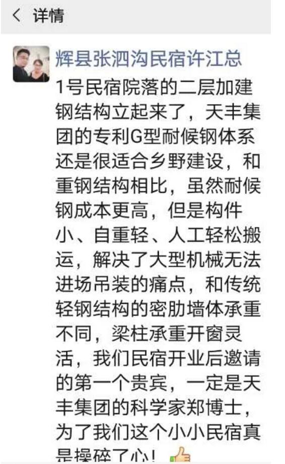 客戶評(píng)價(jià)說:“天豐綠色裝配集團(tuán)的集術(shù)建筑結(jié)構(gòu)體系還是很適合鄉(xiāng)野建設(shè)的,和重鋼結(jié)構(gòu)相比,集術(shù)建筑構(gòu)件小、自重輕,人工能夠輕松搬運(yùn),解決了大型機(jī)械無法進(jìn)場(chǎng)吊裝的施工難點(diǎn)。和傳統(tǒng)輕鋼結(jié)構(gòu)的密肋墻體承重不同,集術(shù)結(jié)構(gòu)梁柱承重,成品建筑開窗靈活,我們民宿開業(yè)后邀請(qǐng)的第一批貴賓,一定是天豐綠色裝配集團(tuán)的工程師們,為了我們民宿項(xiàng)目,他們真是操碎了心!”